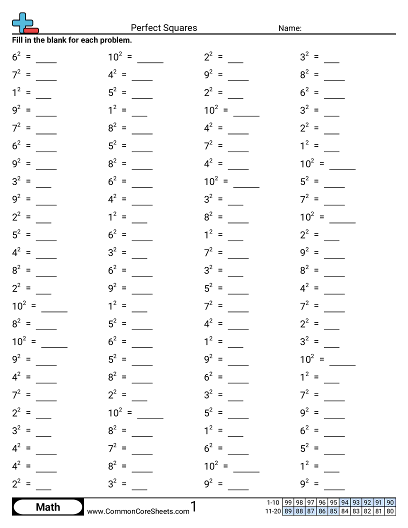 Free math worksheets on Perfect Squares. Each worksheet has 100 problems with an answer key and are ideal for teachers and homeschooling. You can download the PDF, create a set of flash cards or set it up for online learning.