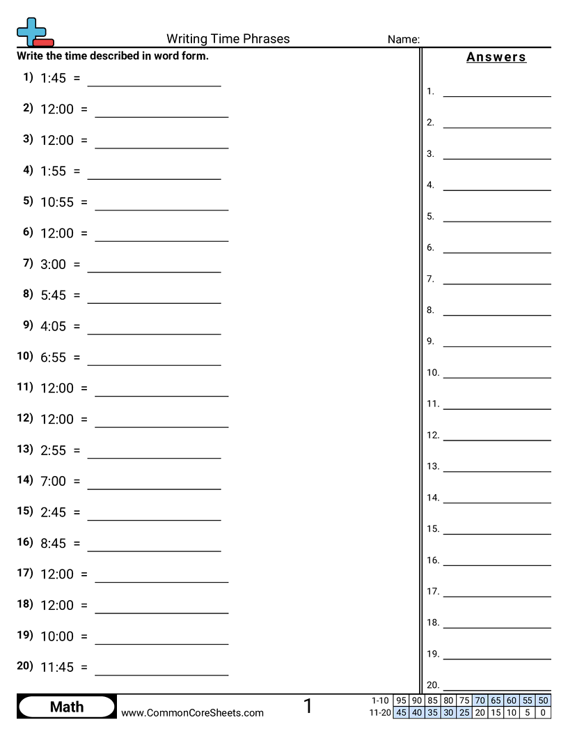 Free math worksheets on Writing Time Phrases. Each worksheet has 20 problems with an answer key and are ideal for teachers and homeschooling. You can download the PDF, create a set of flash cards or set it up for online learning.