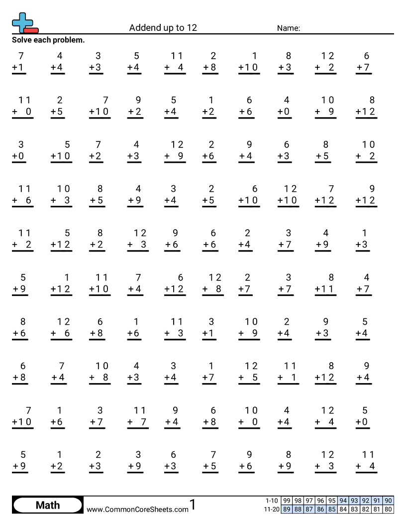 Each worksheet has 100 problems with an addend up to 12.