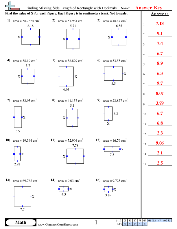 Understanding of ConceptsAfter completing the worksheet, students should have a detailed understanding of the concept of areas, specifically related to rectangles. Understanding the formula for finding the area of a rectangle and its practical implications should be achieved which is instrumental in further geometrical calculations.Proficiency in CalculationsStudents should be able to skillfully use decimals in mathematical computations. This worksheet offers a comprehensive practice of calculations involving decimals. Students enhance their proficiency in handling complex mathematical computations through repetitive exercises.Problem Solving SkillsThis worksheet requires students to apply critical thinking skills to find the missing side length of a rectangle given the area. This potentially enhances their problem-solving competency, facilitating their ability to decipher and resolve complex mathematical problems with ease.Application of TheoryStudents should be able to comprehend how theoretical concepts are applied in real-life situations. The worksheet, designed with practical examples, broadens their understanding of the applicability of mathematical theories outside the realm of textbooks.Mastery in Geometry FundamentalsFamiliarity with the foundational concepts of Geometry is essential for tackling complex theorems and calculations. With consistent practice through this worksheet, students should be well-versed in the basics of Geometry, specifically the calculations involving the dimensions of a rectangle.Enhancement of Numerical CompetenceThrough meticulous and thorough practice, students should boost their overall mathematical competencies. This includes improvement in speed and accuracy of calculations, ability to interpret numeral data and enhance the capability of visualizing mathematical patterns and structures.Preparing for Advanced MathWith the foundation built on these basic geometry concepts, students will be prepared to tackle more complex mathematics. This solid base is essential for future topics such as algebra, trigonometry, and advanced geometry. Their number fluency should be improved and they will be well-equipped to face more challenging numerical tasks with confidence.