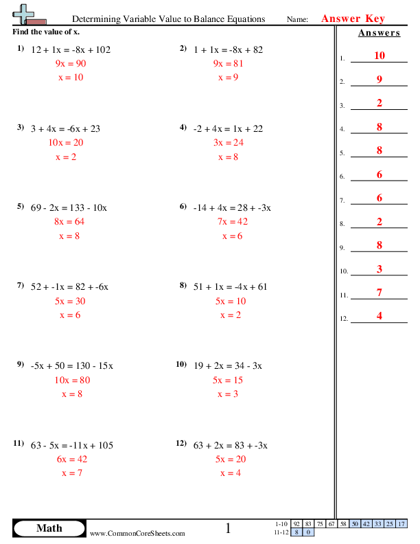 Problem Solving SkillsAfter completing the worksheet, students are expected to develop enhanced problem-solving skills. This math-focused worksheet provides ample opportunities for students to apply their mathematical knowledge and logic, breaking down a larger problem into manageable parts. They learn to identify patterns and relationships, critical in the field of mathematics. The emphasis on balancing equations helps them understand the importance of equality and justice in maths, thereby honing their problem-solving skills.Critical ThinkingThe worksheet promotes critical thinking by requiring students to analyze and solve each equation carefully. They learn to question, probe, and evaluate each problem, developing the ability to make logical deductions. Each task encourages them to explore different possibilities and figure out the most workable solution. This exercise eventually enhances their cognitive function, enabling them to think more analytically and theoretically.Mathematical LiteracyPost completion of the worksheet, students are also expected to improve their mathematical literacy. Working out these problems strengthens understanding of mathematical terminology and symbols. Regular exposure to these elements aids in effortless comprehension, reading, and application of mathematical concepts. The worksheet provides the foundation needed for advanced learning in mathematics.AdaptabilityStudents should be able to demonstrate adaptability after completing the worksheet. Each problem varies in its structure and method of solution, thus promoting flexibility in thought and approach. Adaptable learners are open to new ideas, resilient in the face of challenges, and able to think creatively to solve problems, skills that are valuable beyond mathematics.Focus and ConcentrationThe worksheet is designed to engage children's attention and promote their focus and concentration. By sitting down and solving each problem, students practice their ability to maintain attention over a period of time, resist distractions, and remain focused on the task at hand, thereby improving their overall performance.Patience and PerseveranceAfter working through the problems in the worksheet, students will understand the value of patience and perseverance. They will sometimes face complex problems that require time and multiple attempts to solve. Through this, they will learn that success often requires perseverance in the face of difficult challenges.