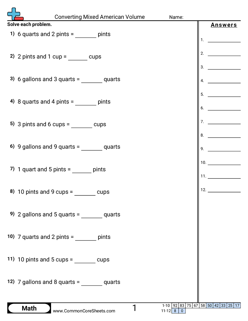Free math worksheets on Converting Mixed American Volume. Each worksheet has 12 problems with an answer key and are ideal for teachers and homeschooling. You can download the PDF, create a set of flash cards or set it up for online learning.
