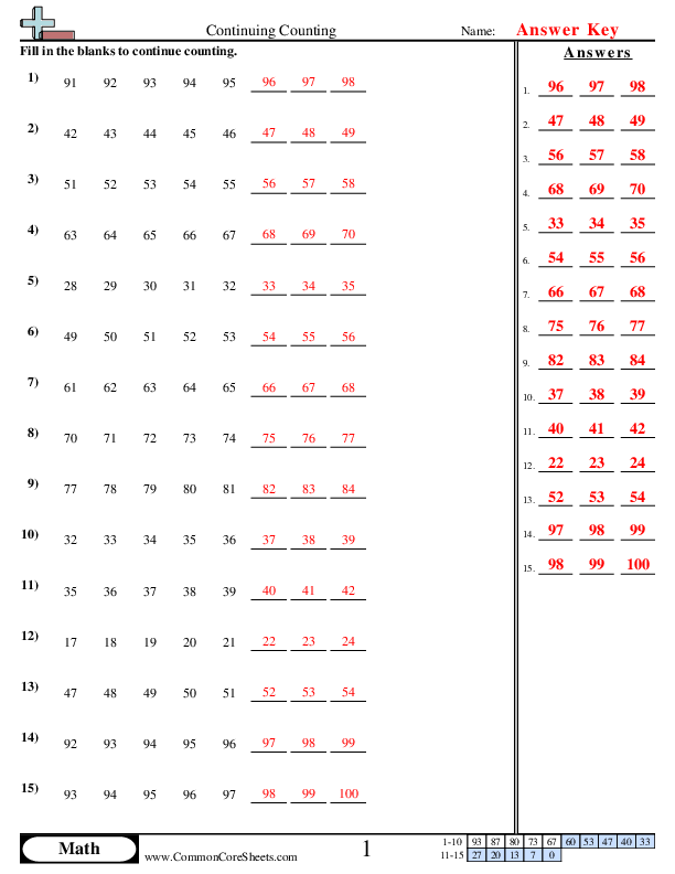 Number RecognitionAfter completing the worksheet, students should have an enhanced ability to recognize numbers. This should not be limited to single-digit numbers but should extend to double and potentially triple-digit numbers. They will understand the 'look' of different numbers and will be quicker and more efficient in spotting them in various contexts.Number SequencingStudents should have developed an improved understanding of number sequences. They should notice patterns and learn the rule of incrementing the count by one. They will be well-equipped to continue with a number series even after it breaks off, thereby solving counting problems with greater ease.Counting FluencyChildren should increase their fluency in counting quantities methodically. That is, the worksheet will enforce their ability to move from one number to the next in an orderly and predictable way. This fluency forms the building blocks of more complicated mathematical reasoning and problem-solving skills.Problem-Solving SkillsAlthough the worksheet is primarily about counting and number recognition, it also encourages rudimentary problem-solving skills. By spotting patterns and applying the rules of counting, each task on the worksheet is essentially a small problem to solve. Over time, this will contribute to the development of broader problem-solving abilities.Confidence in MathematicsAs children master the ability to count and recognize numbers, they should gain increased confidence in their mathematical abilities. The consistent progression through the number sequences in the worksheet should bolster self-assuredness, leading to a more positive attitude towards math.Preparation for Advanced Math ConceptsWhile counting may seem like a straightforward endeavor, it's a fundamental math concept that lays the foundation for more advanced topics. Thus, students will be better prepared to tackle tasks involving addition, subtraction, multiplication, and division in the future, underlining the continued importance of number familiarity and sequencing competency.