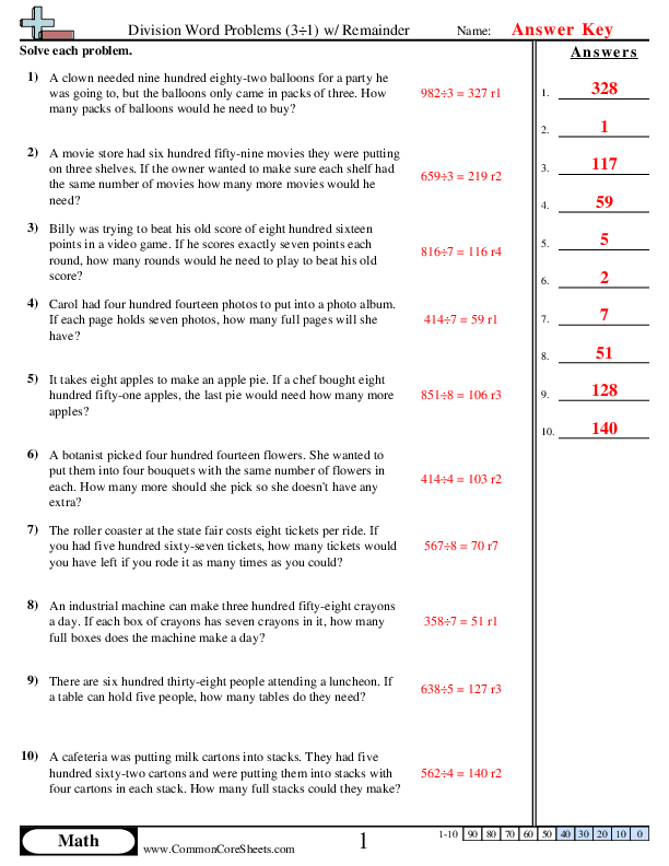 Division Mastery SkillsUpon the completion of this worksheet, students should have achieved mastery in dividing larger numbers and handling remainders in real-world contexts. These problem scenarios require using division operations with a deeper understanding of the remainder. They should be equipped to divide numbers that result in a quotient and a remainder, allowing them to handle any division situation correctly and confidently.Enhanced Problem-Solving AbilitiesThrough tackling division problems in diverse real-world scenarios, students develop their problem-solving skill set. Solving word problems necessitates reading comprehension, interpreting context, connecting mathematical operations to concrete scenarios, and picking the appropriate operation, thereby honing their strategic thinking and logical reasoning abilities.Mathematical Reasoning and CommunicationThis worksheet would also have facilitated the development of mathematical reasoning and communication. By engaging with the problems, students learn to systematically interpret and solve equations, then articulate their procedure and the rationale behind it. This ability to articulate their thought process is a crucial aspect of mathematical learning and communication.Understanding of Real-World Math ApplicationsAfter completion, students should have a greater appreciation for the real-world applications of mathematics. The worksheet's problems touch on various life aspects, like shopping, gaming, cooking, and more. This linkage between math and daily life situations allows students to see the relevance of learning mathematical operations like division in the context of their personal lives.Improved Computational FluencyWorking through these division problems will also lead to an improvement in students’ computational fluency. They should be able to perform arithmetic operations with speed and accuracy, and understand the concepts underlying these operations. This fluency lays the foundation for problem-solving using more complex and advanced mathematical concepts.