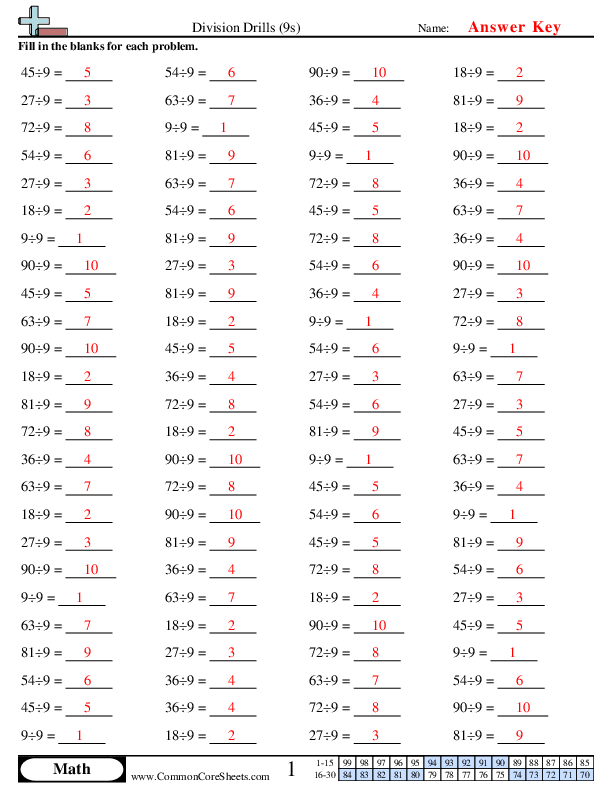 Mastering Division FactsUpon completing this worksheet, students should be able to effortlessly execute division operations using the number 9. They will be proficient in dividing various numbers by 9, a key mathematical skill that helps in computational fluency. This understanding will extend to not only the specific problems presented in the worksheet but also to a wider array of numbers, thereby expanding their mathematical competencies.Strengthening Mental Math SkillsThe repetitive nature of the problems in the worksheet will encourage students to develop and utilize mental math skills. This will boost their speed and accuracy in problem-solving. Mental math is an essential cognitive ability that also helps children in day-to-day practical situations.Building Confidence in MathematicsMathematics can be a daunting subject for many students. However, conquering a set of problems like those in this worksheet can provide a significant boost to the students' confidence. This enhances their self-esteem, making them more open to exploring and embracing more complex mathematical concepts in future learning experiences.Understanding Mathematical PatternsThis worksheet trains students to identify, understand, and utilize patterns in mathematics. The realization that multiplication and division are inverse operations and the skill to use this knowledge to solve problems is a substantial step in their mathematical education journey.Improving Problem-solving SkillsSuccessfully maneuvering through these division problems will enhance students’ problem-solving skills. This improvement is not confined to math but can be translated to other subjects and real-life situations. Students will become better equipped to break down complex problems into manageable, solvable parts.