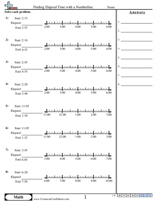 Each worksheet has 8 problems finding the time elapsed with a numberline.