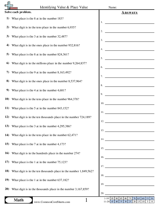 Each worksheet has 20 problems identifying the value and place value of a number.
