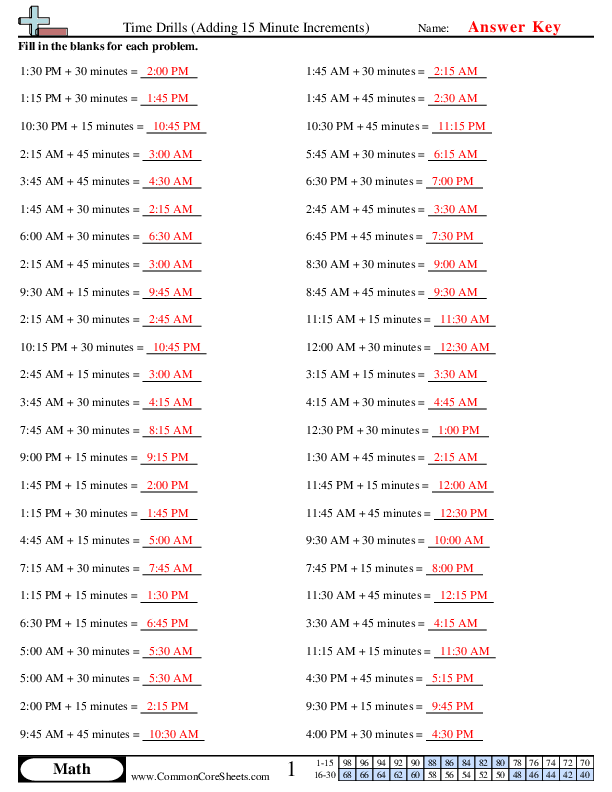Improve Time ComprehensionUpon completing the worksheet, students should markedly improve their time comprehension. The drill of subtracting 15-minute increments from different times will enable them to understand the passing of time and how it can be measured, traced, and calculated. This is vital in their day-to-day activities such as adhering to schedules and planning their time effectively.Enhance Arithmetic SkillsThis worksheet will also enhance the student's arithmetic skills. Subtracting time involves both an understanding of time comprehension and numerical subtraction. Not only will they learn to subtract basic units of time, but they will also become comfortable with calculating greater time differences.Develop Faster Calculating SpeedAs the worksheet is a time drill containing a substantial number of problems, students will develop a faster calculating speed. The repetitiveness of the problems will promote better familiarity with time subtraction operations. The exercise of continuous practice in subtracting many 15-minute increments will help students increase their speed in solving similar math problems in the future.Promote Critical ThinkingThe completion of this worksheet will promote critical thinking, decision-making, and problem-solving skills. With every problem they solve, students will enhance their ability to use logic, understand consequences, and make quick decisions, important skills that can be applied not only in math but in all other aspects of their academic pursuits.Boost Confidence in Solving Math ProblemsSolving all the problems correctly will surely boost the confidence of students in handling math problems related to time. As they progress and get more answers right, they will start to feel more confident in their arithmetic abilities. This boost in confidence can translate into a general improved performance and interest in math and other related subjects.Familiarize with 24-Hour ClockBy solving the problems provided in this math worksheet, students will familiarize themselves with the 24-hour clock system. The worksheet presents time problems in both AM and PM format, thereby preparing them to better understand and calculate the time in a 24-hour format, which is a vital life skill.
