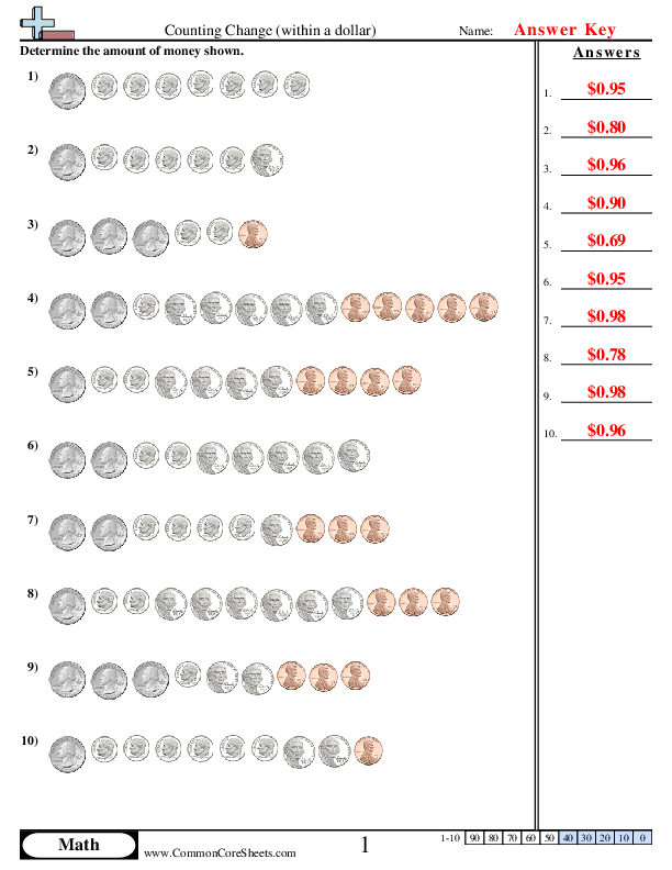 Mathematical Skills DevelopmentUpon finishing the Counting Change worksheet, students would have developed an enhanced understanding of basic monetary values and computations. They will get smarter in counting money, more specifically, coins available within a dollar. This will not only help in reinforcing their number recognition skills but will also promote the application of arithmetic operations in practical, real-world scenarios.Number Sense ImprovementBy mastering the task of counting change within a dollar, students further strengthen their number sense, a critical aspect of early mathematics learning. Improved number sense leads to their better grasp of number relationships, promotes the understanding of numerical magnitude, and allows them to perform mental math more proficiently.Problem-Solving Ability EnhancementAs the worksheet incorporates problems requiring them to calculate and verify amounts, it provides an opportunity to enhance their problem-solving skills. This improvement in problem-solving abilities aids their academic development, forming the cornerstone for more complex future learnings in mathematics and other STEM-related subjects.Knowledge Application in Real-life SituationsThe Counting Change worksheet stimulates students' minds to apply learned math concepts practically. As they tackle this exercise, students will get equipped with essential money management skills required in the real world. They will become more competent in handling money, ensuring the correct calculation of change during financial transactions, and fostering the beginning of financial literacy.Boosted Confidence and Independent LearningAfter successfully completing the worksheet, students will experience a surge in their confidence levels. The feeling of accomplishment when solving a problem independently reinforces self-assurance and encourages self-driven learning. They will begin to tackle new problems with a positive mindset, fostering a rounded development of mathematical proficiency and ensuring continued academic progress.