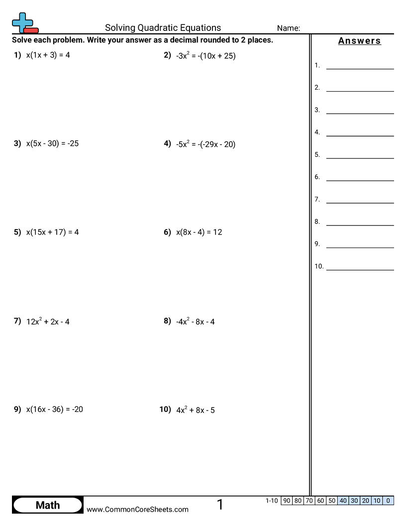 Free math worksheets on Solving Quadratic Equations. Each worksheet has 10 problems with an answer key and are ideal for teachers and homeschooling. You can download the PDF, create a set of flash cards or set it up for online learning.