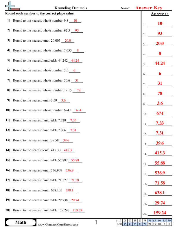 Develop Understanding of RoundingBy successfully completing this worksheet, students will solidify their understanding of the concept of rounding. They will become familiar with the methods of rounding to the nearest hundredth, tenth, and whole number. This key arithmetic skill is integral to many areas of math and will help students estimate numbers quickly and accurately.Enhance Numerical FluencyEngaging with these problems will work to enhance students' numerical fluency. As they round decimals, they will become swift and confident in their ability to work with numbers. Numerical fluency is the foundation of all mathematical skills and abilities, and its development will greatly benefit students in their math education.Improve Mathematical Problem Solving SkillsEach problem in the worksheet requires students to apply problem-solving strategies. They will need to reason and make decisions about which place value to round to. This process enhances their problem-solving abilities, a critical skill in advanced mathematical concepts and in daily life situations.Encourage Precision in Mathematical ComputationThis worksheet will teach students the importance of precision in mathematical computations. Rounding is an essential skill that fosters meticulousness and accuracy. Appreciation of precision in mathematics can extend to increased perfection in other subjects and disciplines.Promotes Self Reliance in LearningDesigned with a step-by-step approach to each problem, this worksheet promotes independent learning. As students round decimals to various place values, they are encouraged to rely on their understanding to solve problems. This self-reliance reinforces the material and builds lasting math skills.Build Confidence in Math SkillsAs students work through this worksheet and see their correct answers, their confidence in their math skills will increase. They will be able to tackle more complex problems and new mathematical concepts with less hesitation. Confidence is integral to learning mathematics, and this worksheet serves to build that assurance.