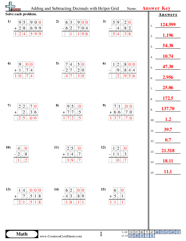 Adding and Subtracting Decimals with Helper Grid