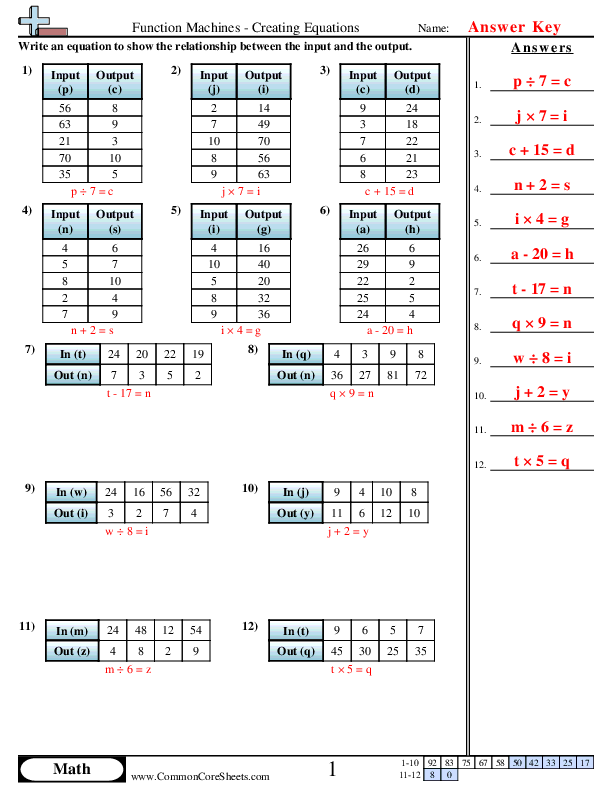 Each worksheet has 12 questions creating an equation from the input and output of a function machine.