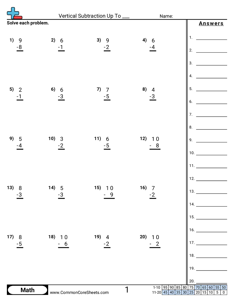 Vertical Subtraction Up To ___ Worksheet Download